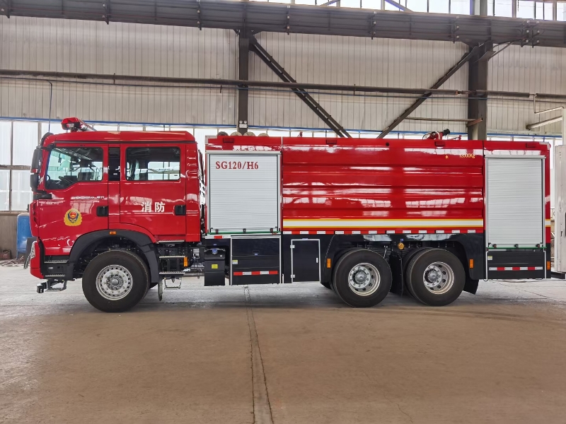 車輛底盤為豪沃ZZ5357TXFV464MF5底盤,發(fā)動機型號MC11.46-61,功率:341kw,國六排放標(biāo)準(zhǔn),軸距4300mm+1400mm,罐體材質(zhì):優(yōu)質(zhì)碳鋼板;容罐容量:水12000kg; 消防泵為雄真CB10/60-XZ;消防炮為威斯特PS50W。